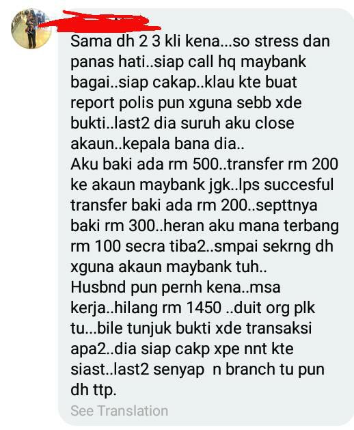 Beberapa pelanggan Maybank yang lain turut tampil dengan pelbagai versi cerita dan pengalaman kehilangan wang di akaun masing-masing. Dan ramai yang menghantarkan komen balas pihak kakitangan Maybank suka mendesak pelanggan untuk mengakui kehilangan wang mereka ada kaitan dengan ahli keluarga dan bukannya dicuri oleh orang luar (scammer).